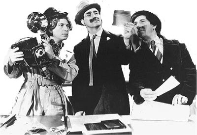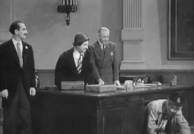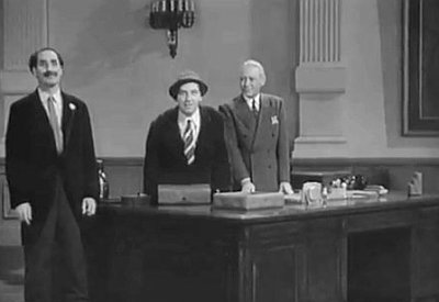 The Big Store film was intended to be the Marxes' farewell as a team and had the working titles Bargain Basement, Step This Way and Gin Rummy. It was released by M-G-M on 20 June 1941. The basic idea of the film and the characters of Groucho (Flywheel) and Chico (Ravelli) derived from an episode of the Flywheel, Shyster and Flywheel radio show. Nat Perrin was a writer on the series and also made the original treatment of this film. Another old routine which was resurrected is Chico's and Harpo's piano switch from Home Again. The trailer for this film is also worth mentioning. It starts with an executive, played by Henry O'Neill, sitting at his desk when he interrupts his duties to address the audience. He speaks about legendary French actress Sarah Bernhardt and her many lucrative "farewell" appearances. O'Neill than goes on to make a "most important announcement", .i.e. that the Marx Brothers are retiring from the silver screen. Groucho (loping in from the left): That's right, folks! We're on our way! Chico (popping up from behind the desk): That's right, folks, but where do we go from here? Harpo climbs out from beneath the desk, waving and honking his horn. Groucho And so... Distracted by the sound of voices, they all head for the window. Outside is a vast crowd crying: No! Groucho We...we didn't know you cared. Chico...where everything is a good buy... Groucho Goodbye! Even if the Sarah Bernhardt-anecdote is excised in most copies - thus weakening the point of the "first farewell picture"-gag - I find the trailer interesting as it forms a kind of cinematic Epilogue, neatly matching Theatrical Agency, the natural Prologue. The visual settings are similar and show the Marxes visiting an office and even if The Big Store-trailer is much shorter and much less elaborate than Theatrical Agency, Groucho seems to deliver his lines in a rhyming fashion reminiscent of the older piece. There's also a kind of strange balance where two pictures (The Cocoanuts and Animal Crackers) are preceding Theatrical Agency (the trailer of Monkey Business) and then - likewise - two pictures (A Night In Casablanca and Love Happy) following The Big Store which indeed became only their FIRST farewell picture. |