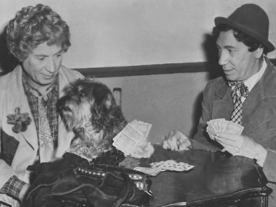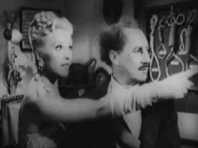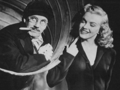 This picture began as an attempt to create a solo vehicle for Harpo. The original story, The Sidewalk (which later became Sidewalks of New York, Diamonds in the Sidewalk or Diamonds in the Pavement) was suggested by Harpo himself and written for him by Ben Hecht, assisted by gag writer Frank Tashlin. The movie, basically a study in pantomime, recalled the freewheeling pre-talkie days, and the word-of-mouth was so good that the project had attracted Leo McCarey as a potential director. But before any of these events could come to fruition, the bottom dropped out. Tashlin, Hecht and Harpo all blamed producer Lester Cowan, who had lied about the film's value to the studio. With the original script literally dashed to bits, Hecht removed his name from the picture which went under a series of working titles like Blondes Up, Blonde Heaven and Hearts and Diamonds - diamonds being so central to the plot - until it finally became Love Happy. Tashlin was paired with Mac Benoff to write a framing story and narration for Groucho who - along with Chico - agreed to appear with their brother who at this point desperate to salvage his dream project. However, the order of events isn't as clear as has been suggested. As early as 20 June 1947 (filming commenced more than a year later), Groucho wrote to his daughter Miriam and mentioned a film Ben Hecht was writing for Harpo and Chico. A subsequent letter (of 25 September) already mentions Groucho's guest role as a narrator. His letter of 18 October 1947 speaks once more of the film, describing it as the story Hecht "wrote for Harpo, and finally Chico got in it, and then I suddenly found myself in it for a brief bit." Additionally, with money running low and to raise funds to complete the movie, the producers came up with the idea of selling advertising space on the neon signs on the roof that was the setting for the ending of the film. Nowadays, product placement like this is very common but back then it wasn't. The overall end result, despite a positive review from The New York Times and other major critics, remained a disappointment to Harpo until his dying day. In what was at one time to be an experiment in pantomime, it is wise-cracking Groucho as low rent private eye Sam Grunion who fares best, particularly in a brief opening scene with Marilyn Monroe, whose appearance in the picture upgraded her to co-star billing during re-releases, some of them under the name Kleptomaniacs. An interesting thing about this film is how it deals with female cleavages. Groucho claimed that the dress of Marilyn Monroe was so low-cut that he forgot the dialogue, which makes it hard to understand why the cleavage of Ilona Massey (Madame Egilichi) very obviously have been blacked out from extant prints of Love Happy. Steven R. Wright has written to me about this and it happens in the scene where Madame Egilichi is giving Harpo the "whammy" to get him to talk and tell her where the sardine can with the Romanov diamonds is. Close-ups of Ilona shows a big black dot on her chest, probably added already during production. ![]() There obviously were a lot of editing and changes before Love Happy premiered on 12 October 1949. Some stills reveal these changes, like Harpo being present when Chico plays card with a dog, and Marilyn Monroe appearing on the rooftop set. Additionally, in the Italian trailer of Love Happy (or Una notte sui tetti, roughly A Night on the Roof), the scene where Groucho attempts to frisk Harpo and Ilona Massey takes place in Grouchos' office instead of on the roof as in the finished film. Maybe this is an indication that all of Grouchos scenes originally were to take place in his office and that some of them were re-shot when the product placement made the rooftop sequence important. Additionally, the DVD-reissue of the film includes six minutes not found in previous versions. These include Groucho describing how he has tracked Madame Egilichi all over the world (showing a series of photos depicting him holding her in various sexy poses, concluding with a photo of her in a 1950's style bathing suit), an additional encounter between Chico and a drooling Leon Belasco who is offered a parade of beauties, as well as different music scoring for some scenes. Steven R. Wright has studied the DVD in detail and here's his report on the differences. He admits that he has "always been kind of soft-headed, uh, -hearted towards this film and I may be the only one out there who enjoys it to the extent of becoming familiar enough with it to notice all these differences". And this is what he noticed: