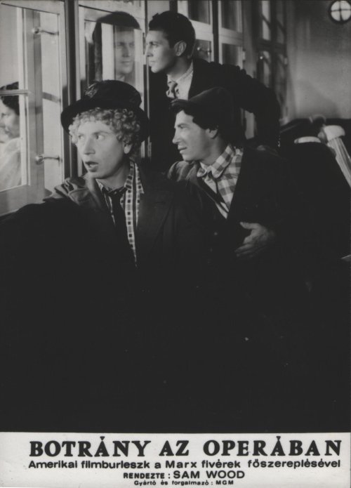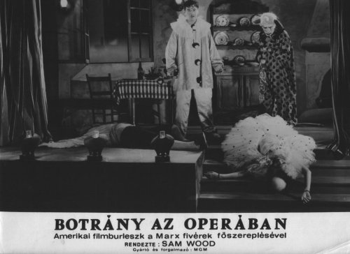 The complete cast list from the film as presented in MGM: The Golden Years, names several characters who actually don't appear in the film, such as Count DiLuna and Ferrando. In an email sent to me on 5 November 2001, Dale Blasingame points out that these are actually from Verdi's Il Trovetore, the opera around which the film is written. "It is possible that these parts were to have been featured and were simply edited for time or some other reason" Dale writes. In an email I received on 2 February 2002, Kay Lhota cites the 1972-book with the script of A Night at the Opera. According to the script, a fire breaks out while all of the crazy goings on at the theater goes on and the Marxes manage to keep the audience from panicking while Ricardo and Rosa hold the audience with their beautiful voices. The last scene of the film (shot at a set that looks like the one used in the Russian Aviators speech scene) was to be the Mayor congratulating the heroes for saving the theater audience (photo provided by Kay Lhota). The Hungarian discoveriesIn 2007 and 2008, Hungarian marxologist Racz Tamas made several important discoveries concerning A Night at the Opera. The first was a Hungarian movie poster depicting an otherwise unknown scene which probably appeared early in the film as it shows Lasparri in clown costume alongside Harpo and Rosa. As can be seen in the present version of the film, Lasparri is appearing with Rosa in a performance of Pagliacci ("Clowns"). That story ends with the jealous Canio (alias Pagliaccio) killing his wife Nedda (alias Colombina) and the villager Silvio. In the play, there's also a fool named Tonio (alias Taddeo). To judge from this, the photo shows Lasparri as Canio/Pagliacci right after he has killed Nedda/Colombina (played by Rosa) and Silvio. To the right stands the horrified witness Tonio/Taddeo, played by Harpo. Next came another movie poster showing yet another scene which isn't in the movie. It's a photo of Harpo, Chico and Allan Jones sitting in front of a window looking in a room on the boat's deck, and in that room sits Maggie Dumont. There is a known alternative shot of this showing them from the room looking in, with Harpo making a cockeyed grimace. After this, Racz Tamas visited the Hungarian National Film Archive to see if they actually had an uncut print of A Night At the Opera, and he found something very interesting indeed! This is his own story: "I watched the first reel of the print of the