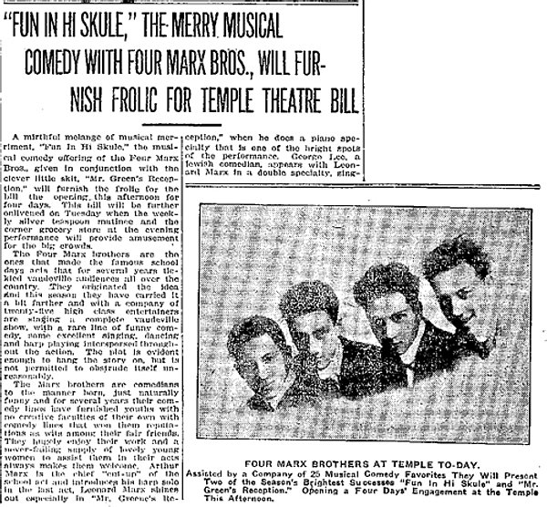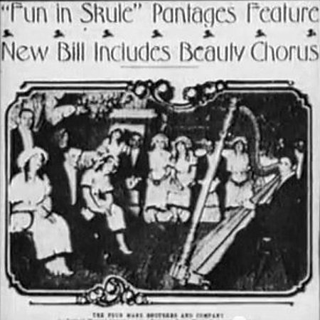 Broadway Musical School Days opened at the Circle Theatre 14 September 1908. With lyrics by Will Cobb and music by Gus Edwards, the song School Days was the centrepiece of the show and by 1910 vaudeville was full of similar schoolroom acts. It was natural for a fledgling comedy team like the Marx Brothers to follow a popular trend and led by Groucho they made their own adaption named Fun In Hi Skule. This was their first show in which comedy and not music was the key ingredient and very soon the Marx Brothers became popular vaudeville comedians. Like virtually everything else in vaudeville, Fun In Hi Skule was just as much "Fun with Ethnic Stereotypes". Groucho portrayed a "Dutch" or German (Deutsch)-accented comic, the stick-carrying Herr Teacher, in frock coat and a scratch wig simulating baldness. He sat at a desk towards the rear of the stage. Either side were doors marked "Boiz" and "Goils". The "Boiz" included Gummo as "Izzy", the Hebrew Boy, and Harpo as "Patsy Brannigan", an Irish-cum-rural type that was a regular character in vaudeville shows. The type was based on a real-life Irish comic of that name active in the 1890s. Harpo describes his Patsy Brannigan costume in Harpo Speaks. In this case, Jenny the ex-girl singer mentioned must refer to the original Nightingale Mabel O'Donnell: "Minnie got out the wig she'd made up for Jenny, our ex-girl singer, cut off the piece that used to cover Jenny's cockeye, and dyed the wig red for me. She sewed bright patches onto my travelling pants, which were pretty well shot anyway, and I used a piece of rope for a suspender. The rest of the costume was my beloved turtle-neck sweater and a decrepit beaver hat that Minnie scrounged out of the boarding-house attic. For a final touch before going onstage, I reddened my ears, painted on some freckles and blacked out three of my front teeth." Another character in the act was the stereotyped homosexual (the "sissy", "nance" or "fairy"), a bass-singer who spoke in falsetto. In The Marx Bros Scrapbook, Groucho writes: "And we had a fairy in the act. The guy wasn't actually a fairy but that's the part he played. He'd say, "Strawberry shortcake, huckleberry pie. Are we in it. Ra, ra, ra!" His name was Paul Yale". Several "Goils" were in the class, including the Marxes' Aunt Hannah (with as thick an accent as Groucho's) and a Lucille or Lillian Textrude. It is generally believed that the class room scene in Horse Feathers gives a good example of what Fun In Hi Skule was like, at least in general appearance. Additionally, Harpo and Groucho has given us several glimpses of the dialogue in the books Harpo Speaks and The Marx Bros Scrapbook respectivally. Harpo had yet to abandon dialogue and could thus explain why he was late for school: "My mother lost the lid off the stove, and I had to sit on it to keep the smoke in". A lot of fun was of course generated by the fact that a "Dutch" teacher was giving "a lesson in der Englisher langvidge", for example in "The Alphabet Bit", Harpo's "big scene" with Groucho. This piece of dialogue is included in Harpo's autobiography; Groucho (whacking his