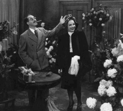 At one point in the film, agent Deveraux suggests a replacement for Fifi and in comes the "old" Groucho with greasepaint-moustache to sing Go West, Young Man (written by Bert Kalmar and Harry Ruby) amid a ranch setting populated by attractive cowgirls. This Groucho and Deveraux are clearly not meant to be one and the same, the one cheering on the other. In his The Marx Brothers Encyclopedia, Glenn Mitchell interprets this as the old Groucho rescuing the new in his time of need. The film Go West was originally developed in 1936 in parallel with A Day At The Races and the first outlines were written by Bert Kalmar, Harry Ruby and William Slavens McNutt. The song Go West, Young Man is probably a left-over from the original Go West. The saying "Go West, young man" was popularized by American author Horace Greeley, who favored westward expansion and is mentioned in the lyrics of the song. In 1952, Groucho recorded Go West, Young Man and a couple of his other trademark songs with the Ken Lane Singers, and there are various differences between the lyrics in the movie and the later recording (thanks to Jon Charles and Stefan Timphus for this info). (as recorded by Groucho and the Ken Lane Singers) Groucho
