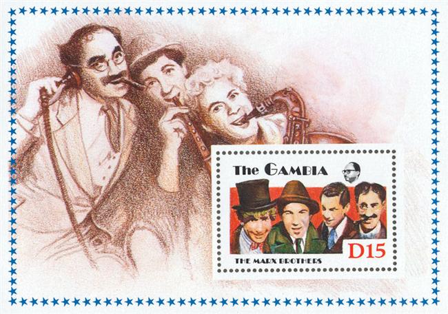 Most of the stamps which depict the Marx Brothers seem to be souvenir editions made just for collectors. Strictly speaking they are not stamps, but just labels. The only genuine stamps appears to be the ones from Israel and the USA. I would guess that most of the other editions have not been in circulation in their country of origin, with some of them I am not even sure if they could be legally used on a letter. If you have any more information about any of these stamps, please let me know. Click on the stamps to see a larger version.