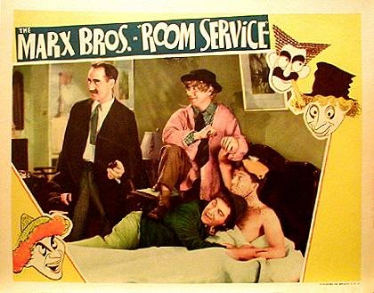 Room Service is unique for other reasons as well. It was the only picture the brothers did for RKO, making it while they were under contract to MGM. It is also the only film that wasn't written specifically for them. As a matter of fact, the movie was taken from a successful play at the suggestion of Zeppo, and tailored by the ever-present Morrie Ryskind (who had to invent a part for Harpo) for the Marxes. This movie was remade as a musical called "Step Lively" in 1944, starring Frank Sinatra.