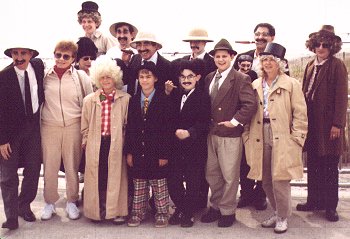 (Left: Two classic, silent comedians have a few words with each other on the reviewing stand after the parade.) The parade may seem to many to be a cheap, thinly-disguised attempt to promote off-season tourism in a Jersey Shore resort community, but it's obvious to all attending the weekend-long shindig that the parade's founders and all its participants are in this thing for the joy of it, not for what little money is involved. Local businesses help to foot the $8,000 bill by sponsoring the parade. And each registered marcher receives a free hotdog lunch and commemorative t-shirt from Dietz and Watson. At the end of the parade, representatives of various fan clubs set up on the Music Pier to hawk their wares. Paul Wesolowski was there this year, still dressed as Harpo, selling copies of The Freedonia Gazette and other merchandise, while Miriam Marx Allen was signing copies of her book, "Love, Groucho." W.C. Fields, Harold Lloyd, Buster Keaton, and others were also represented.