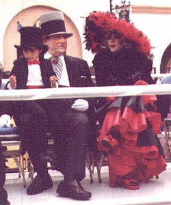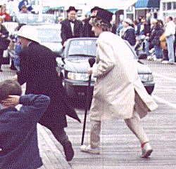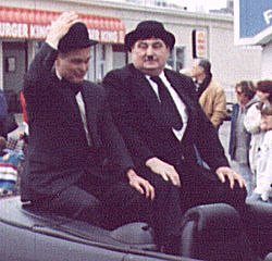 (Right: A couple of guys dressed up as Laurel and Hardy, earning them the honor of riding in the parade.) The parade's concept is a fairly simple one: Get a whole bunch of people together, dressed in outlandish costume and doing really weird things, and march them down the boardwalk. This fact was painfully obvious to me as I made my first visit to the parade this year. Parked near the reviewing stand, I saw all manner of celebrity impersonators, including W.C. Fields, Charlie McCarthy, Mae West, Abbott and Costello, Laurel and Hardy, Al Jolson, and even Sophie Tucker, pass by. And several local groups of performers also got into the spirit of the event, many donning "Groucho Glasses" for the occasion.