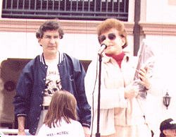 (Left: Miriam Marx Allen accepts a lifetime achievement award for her famous father (Groucho) and uncles from Ocean City DooDah co-founder, Mark Soifer.) But while weirdness has always been the order of the day for this event, it wasn't until 1993 that someone came up with the brilliant idea of using the parade to honor classic comedians. The Marx Brothers are the sixth to receive such an honor. Spike Jones, who was the first in 1993, was followed by Ernie Kovacs in 1994, The Honeymooners in 1995, Abbott and Costello in 1996, W.C. Fields in 1997, and finally the Marxes in 1998. This year, Groucho's daughter, Miriam Marx Allen, was flown in from California to accept a lifetime achievement award for the team.